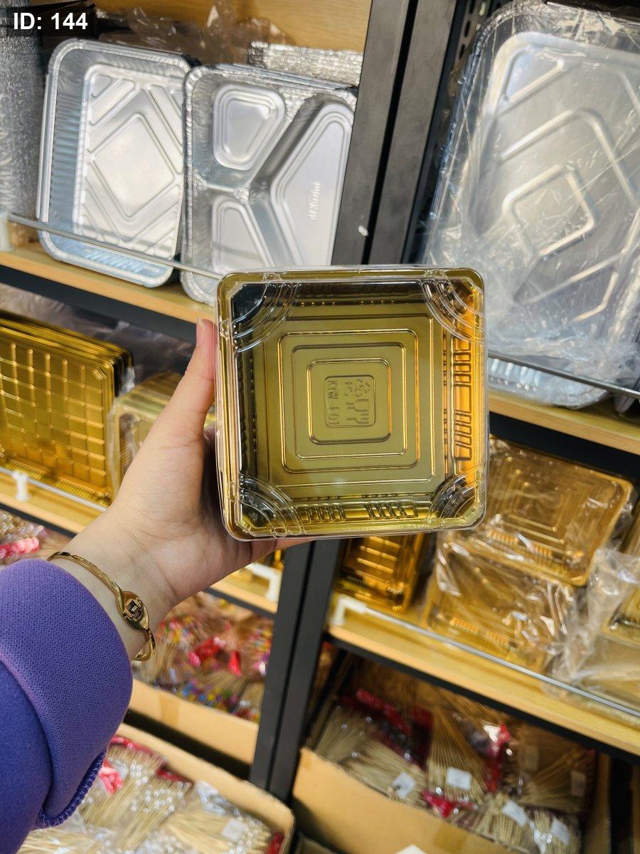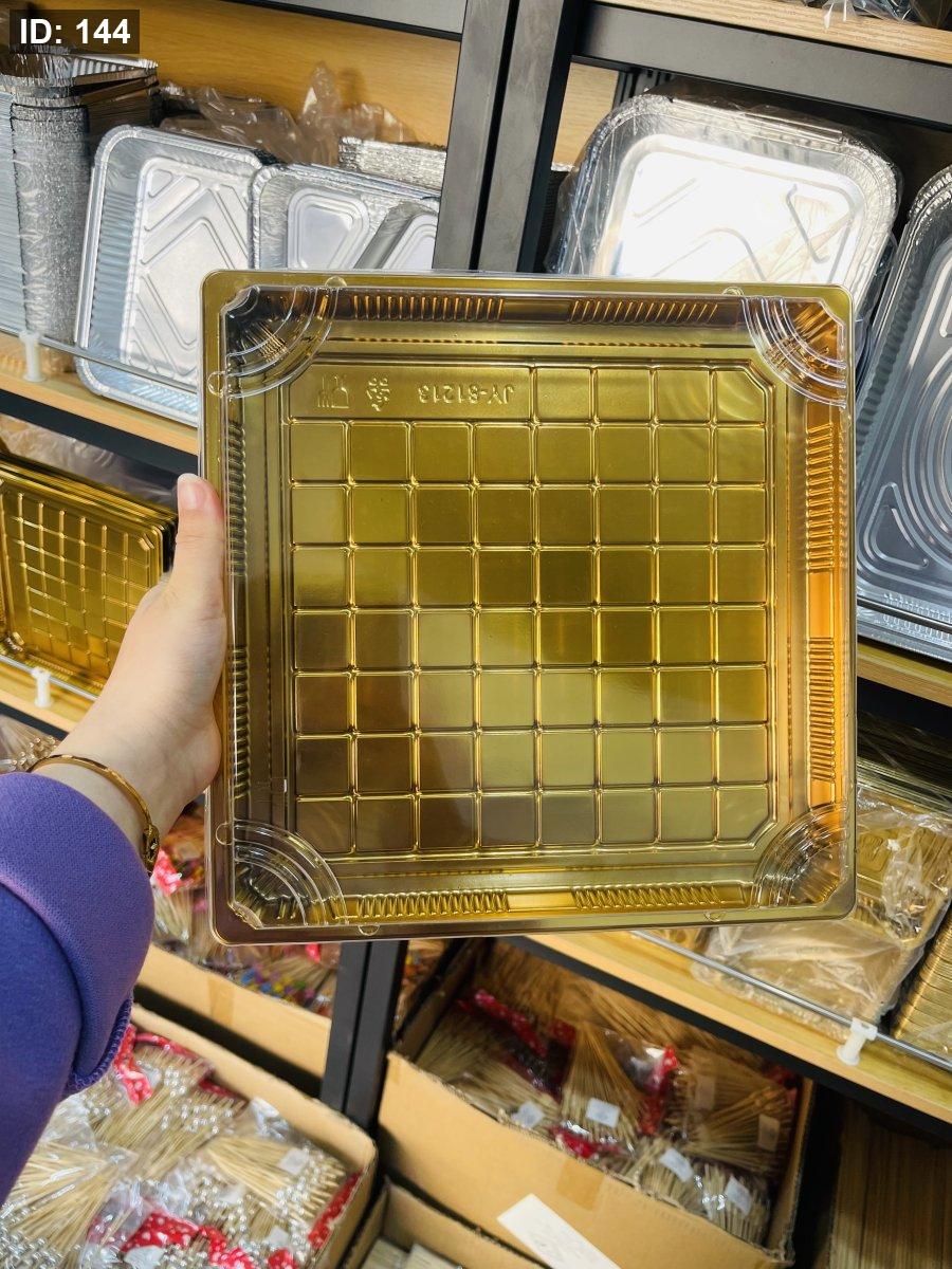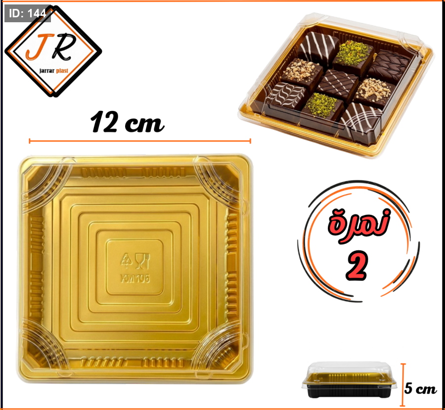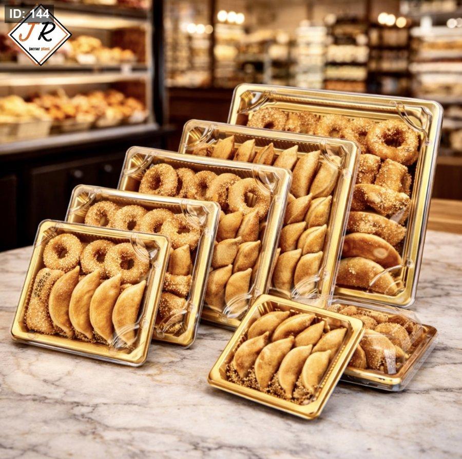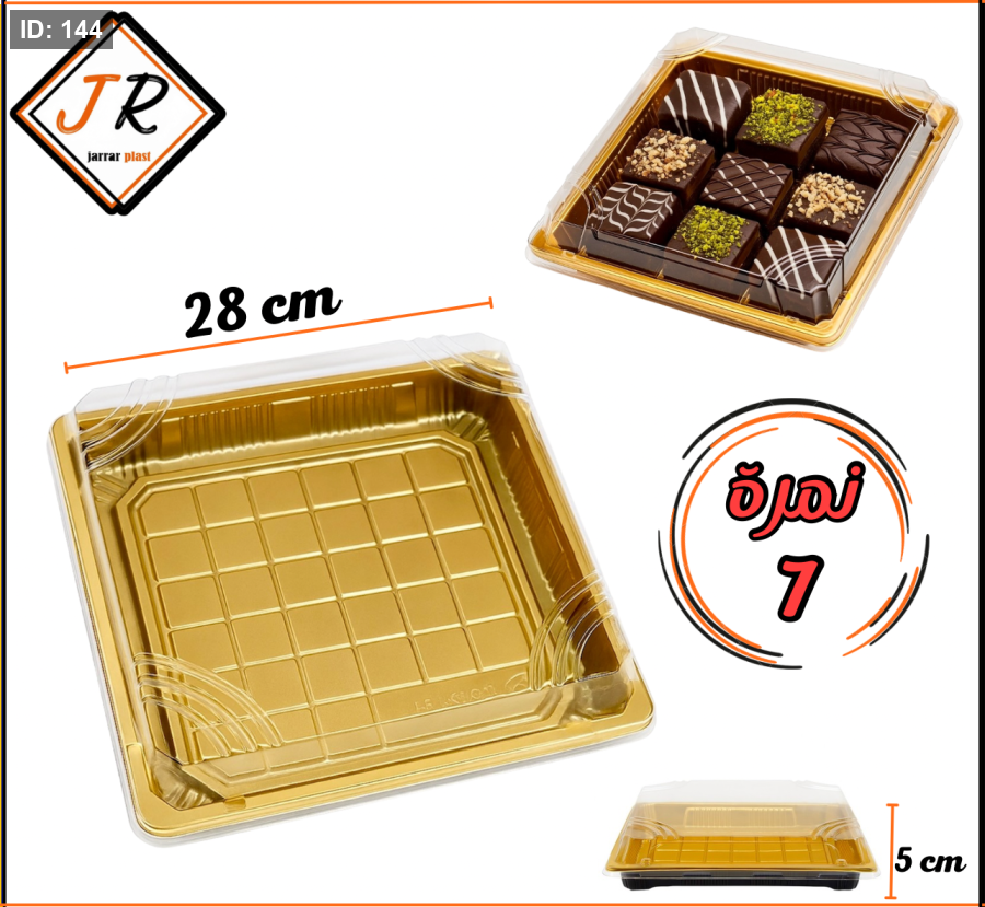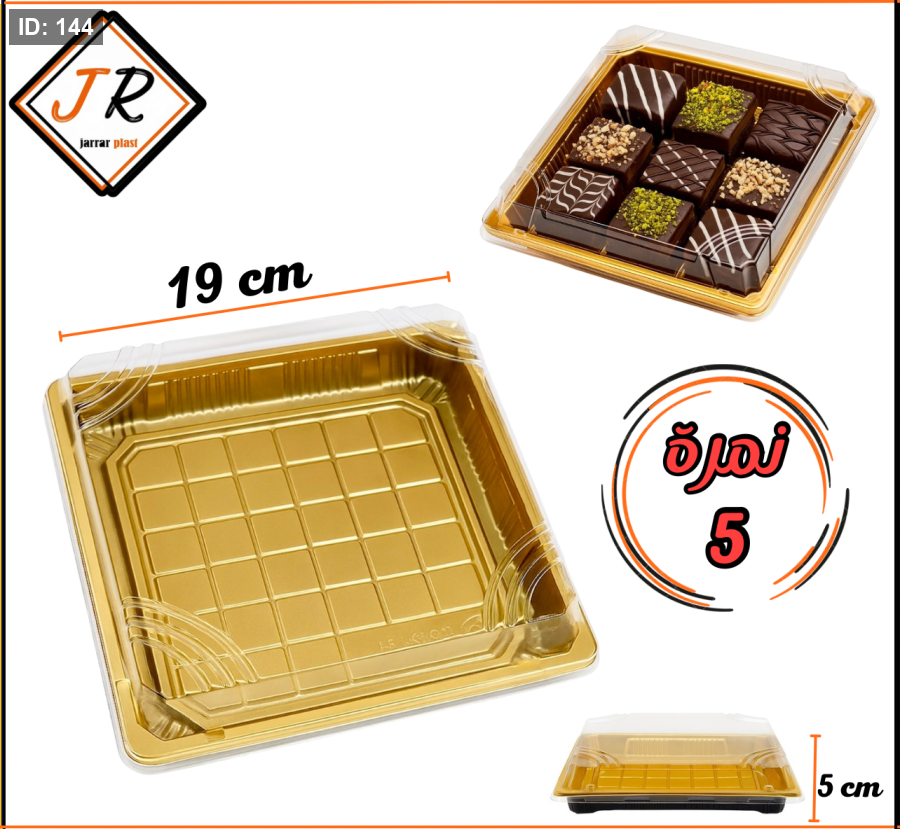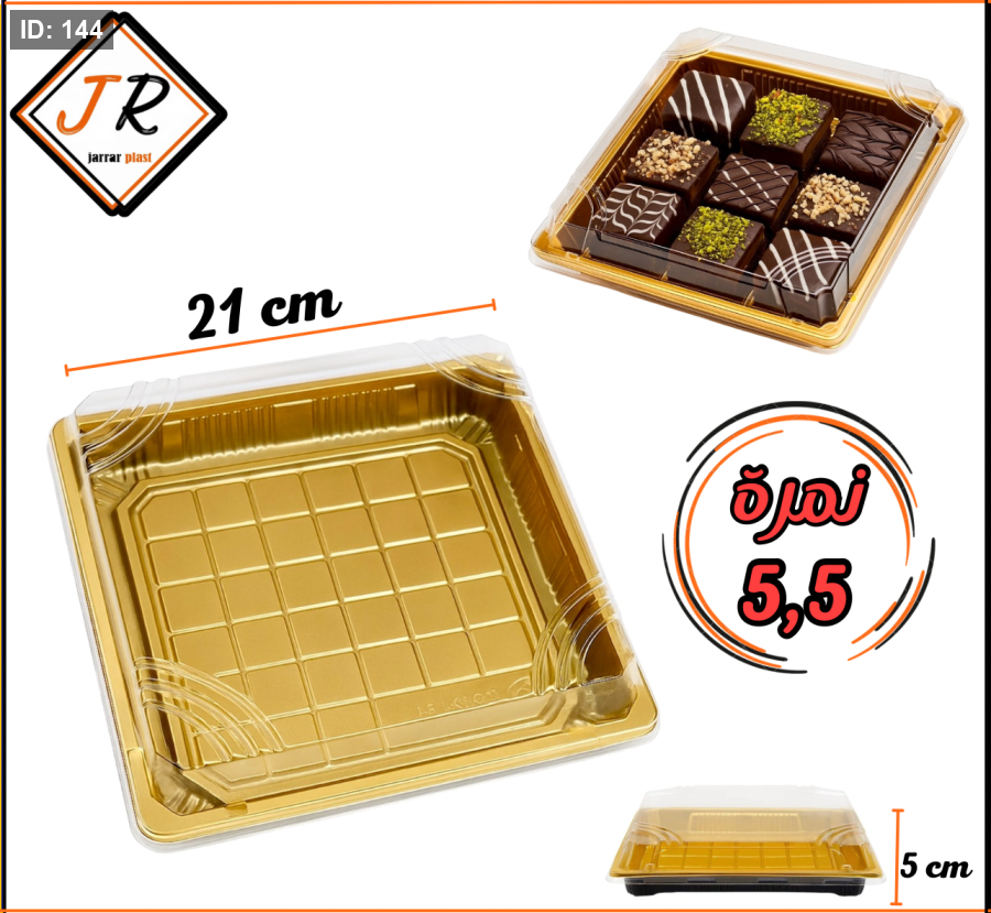 علبة بلاستيكية فاخرة باللون الذهبي اللامع بغطاء شفاف، مثالية لتغليف الشوكولاتة والحلويات بشكل أنيق بعدة احجام والعلب شاملة الاغطية