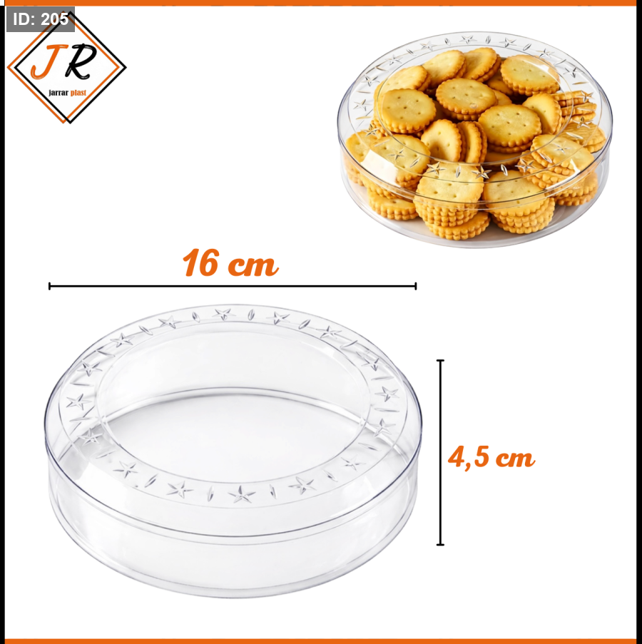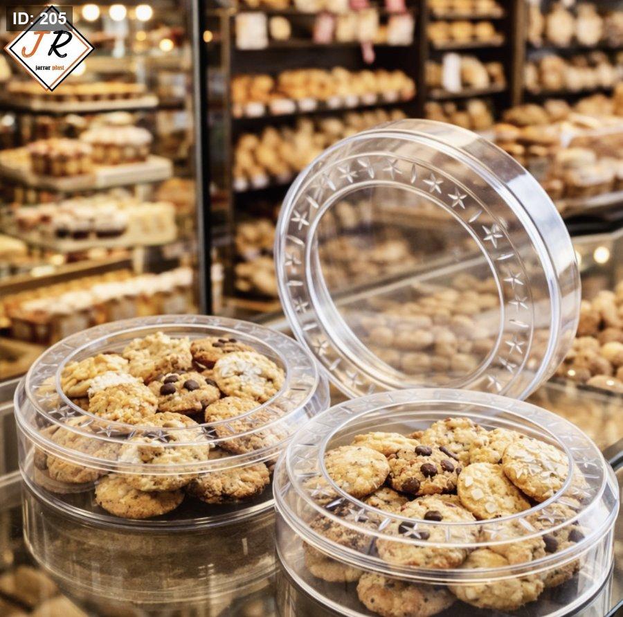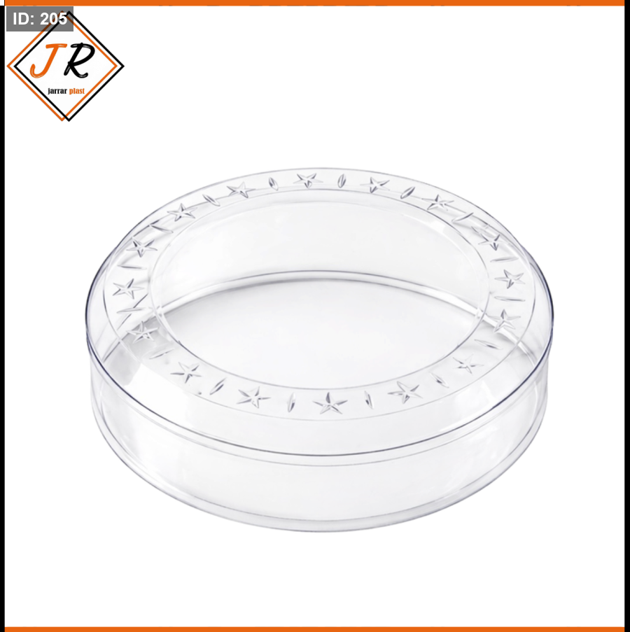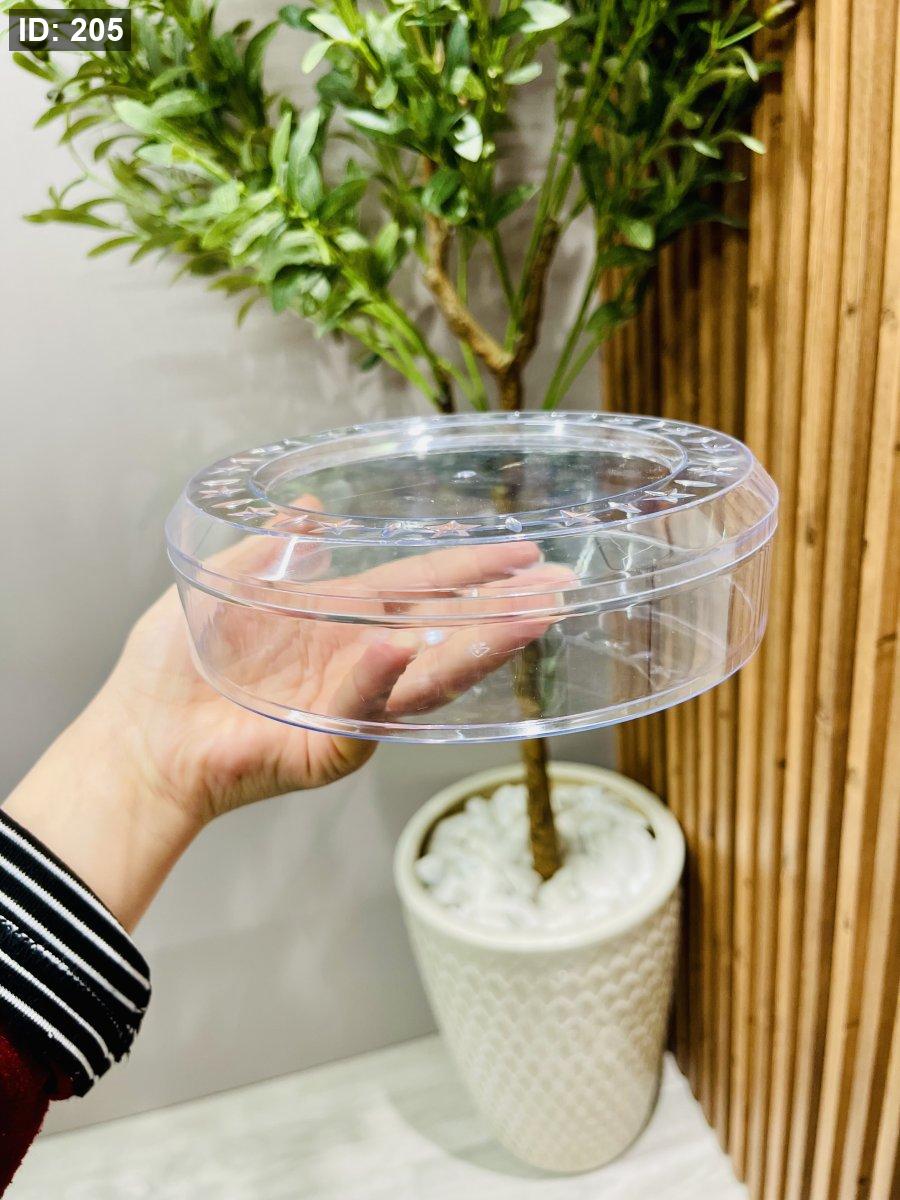 علبة أكريليك دائرية كبيرة بتصميم فاخر وشفاف، مثالية لعرض الحلويات والفواكه بشكل أنيق يلفت الأنظار ويبرز جمال المحتوى