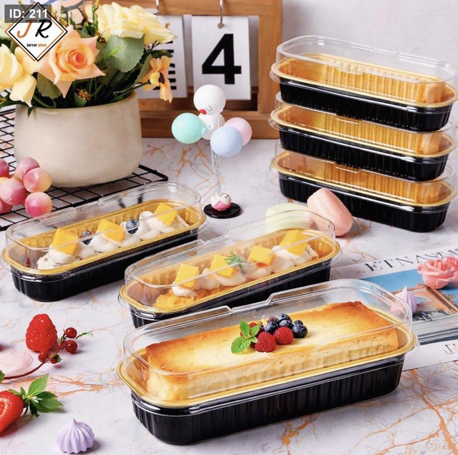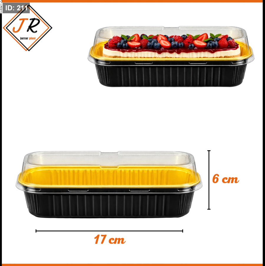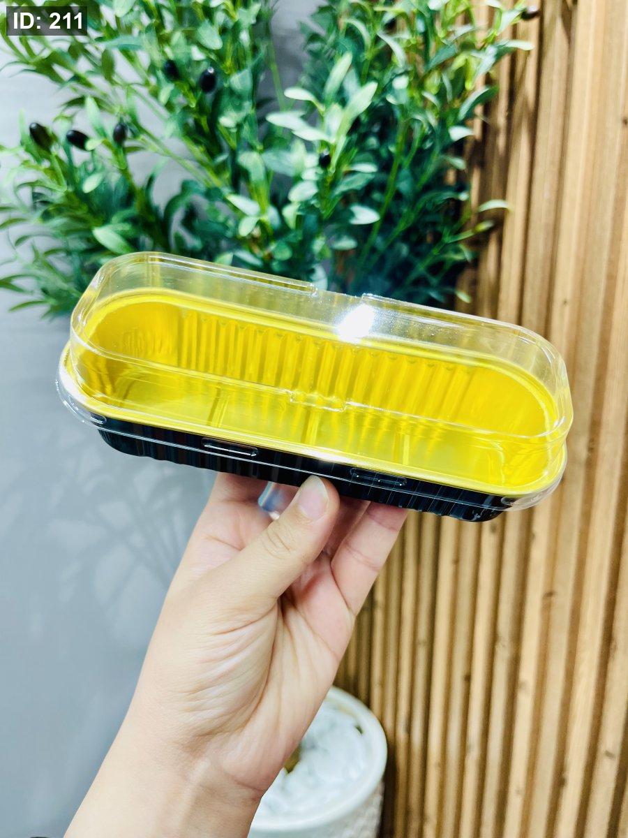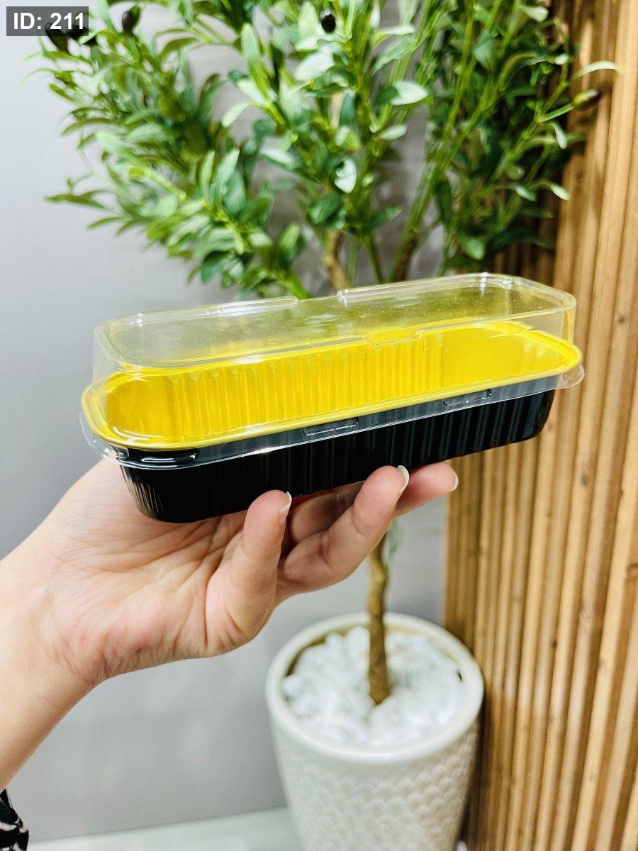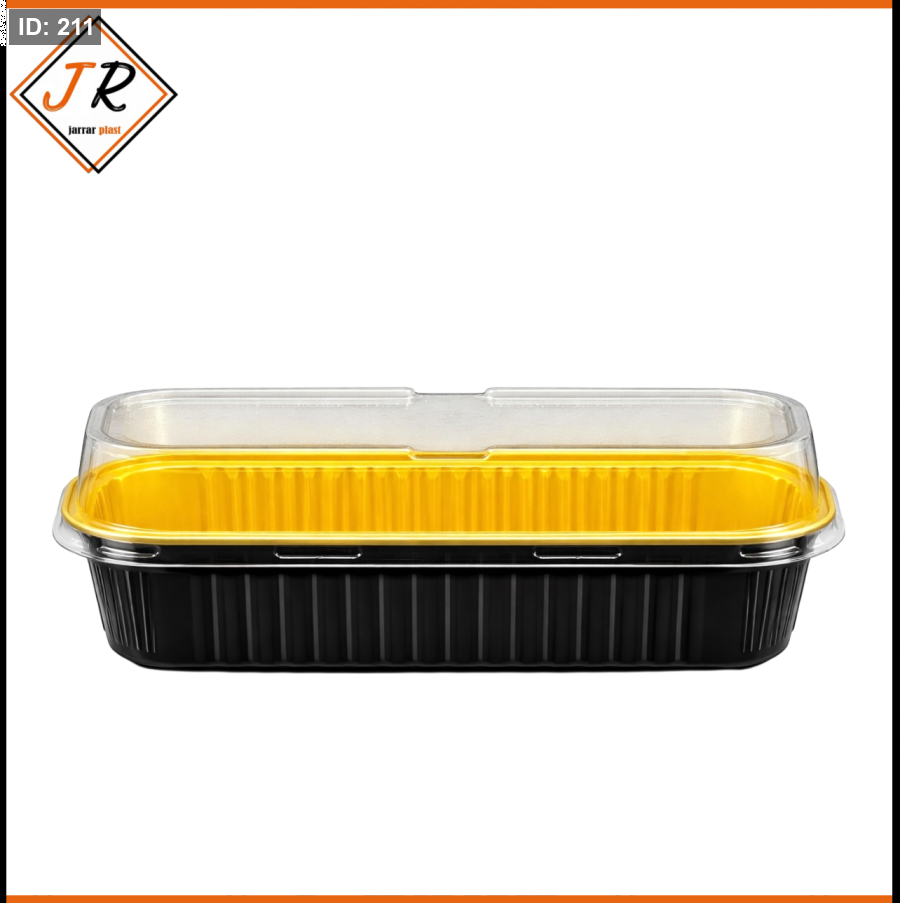 علبة قصدير مستطيلة باللون الأسود والذهبي بغطاء شفاف، تتميز بتصميم أنيق وعصري يضفي لمسة فخامة على استخدامها ويحافظ على محتوياتها بأمان