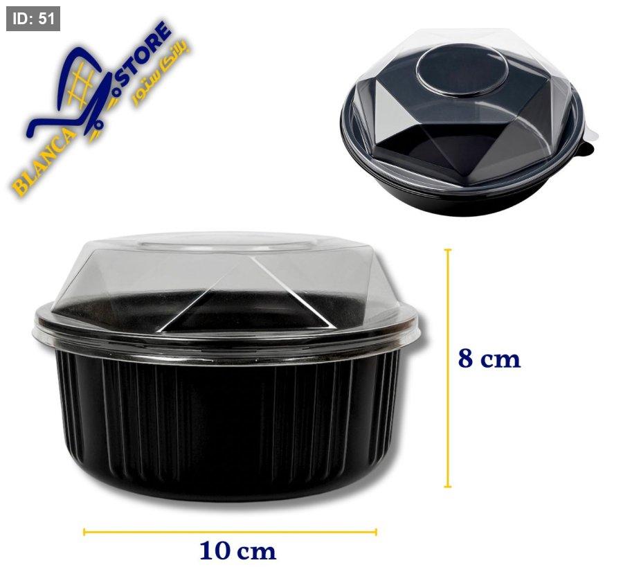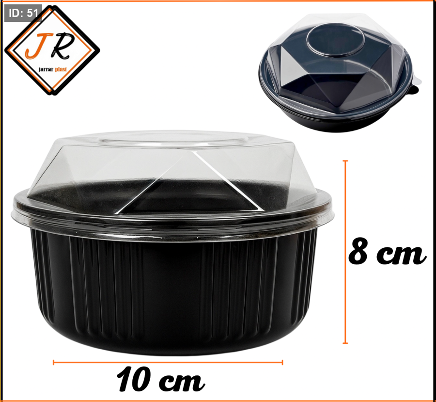 علبة دائرية بقاعدة سوداء وغطاء شفاف مثالية لحفظ الحلويات بأمان وأناقة متوفرة في ربطة تحتوي على 25 علبة