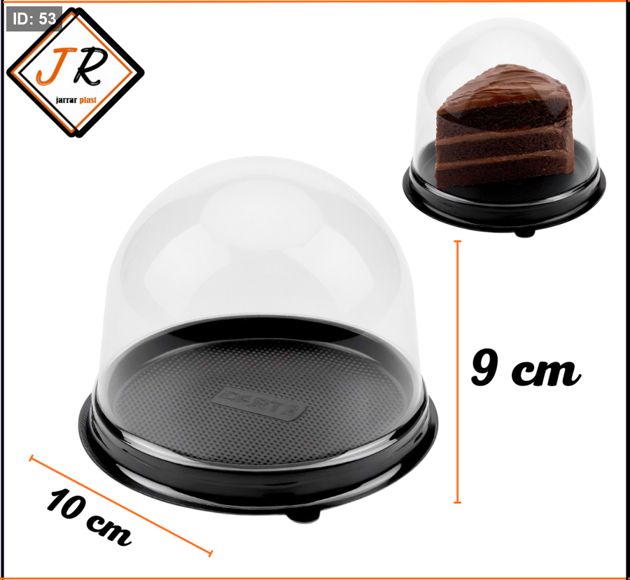 علبة بلاستيكية شفافة دائرية الشكل بغطاء قبة وقاعدة سوداء، مصممة خصيصًا لتغليف وعرض وحماية الكيك