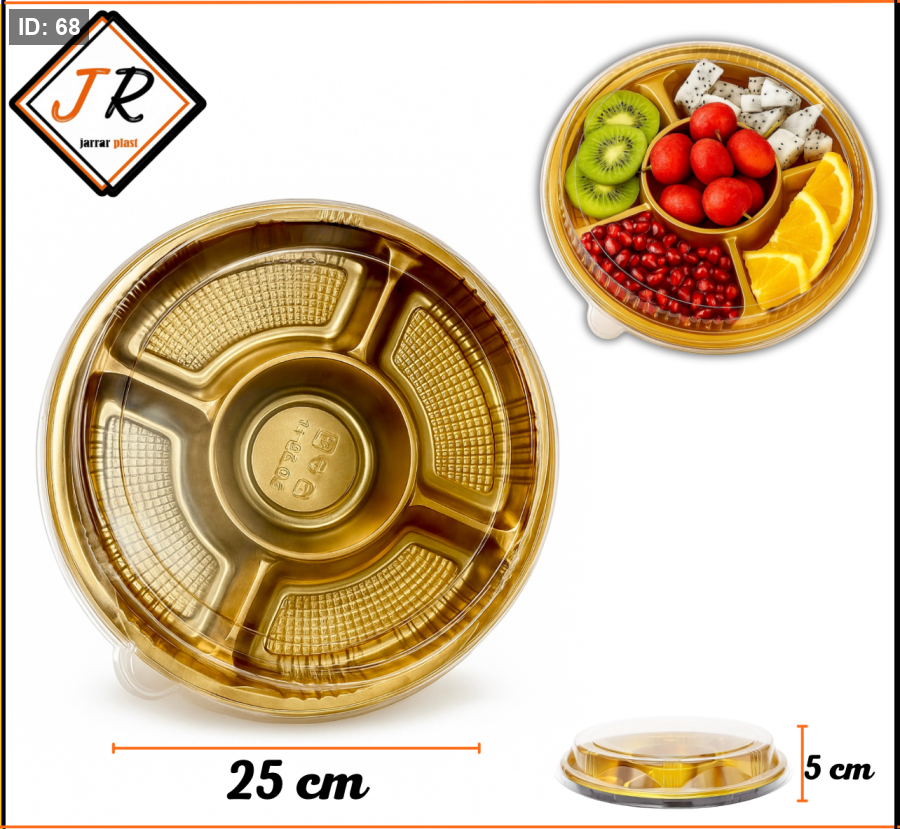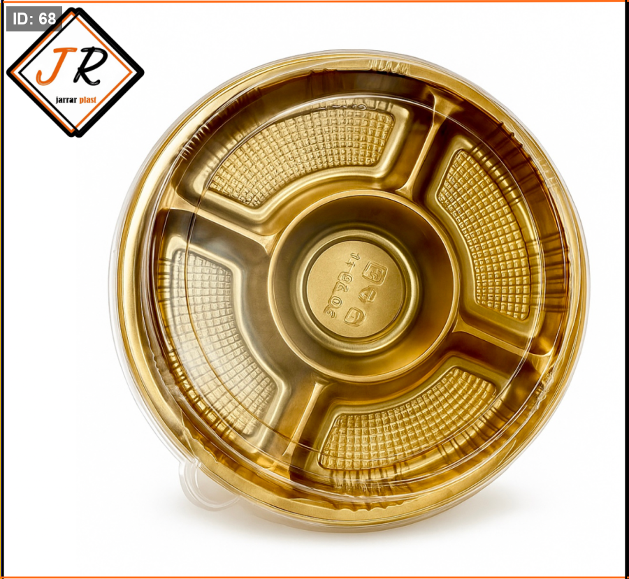 تتميز بتصميم فاخر بلون ذهبي أنيق، تتضمن 5 أقسام منفصلة، مما يجعلها مثالية لتنظيم وتقديم مجموعة متنوعة من الأطعمة بشكل منفصل مصنوعة من مواد بلاستيكية متينة وقوية