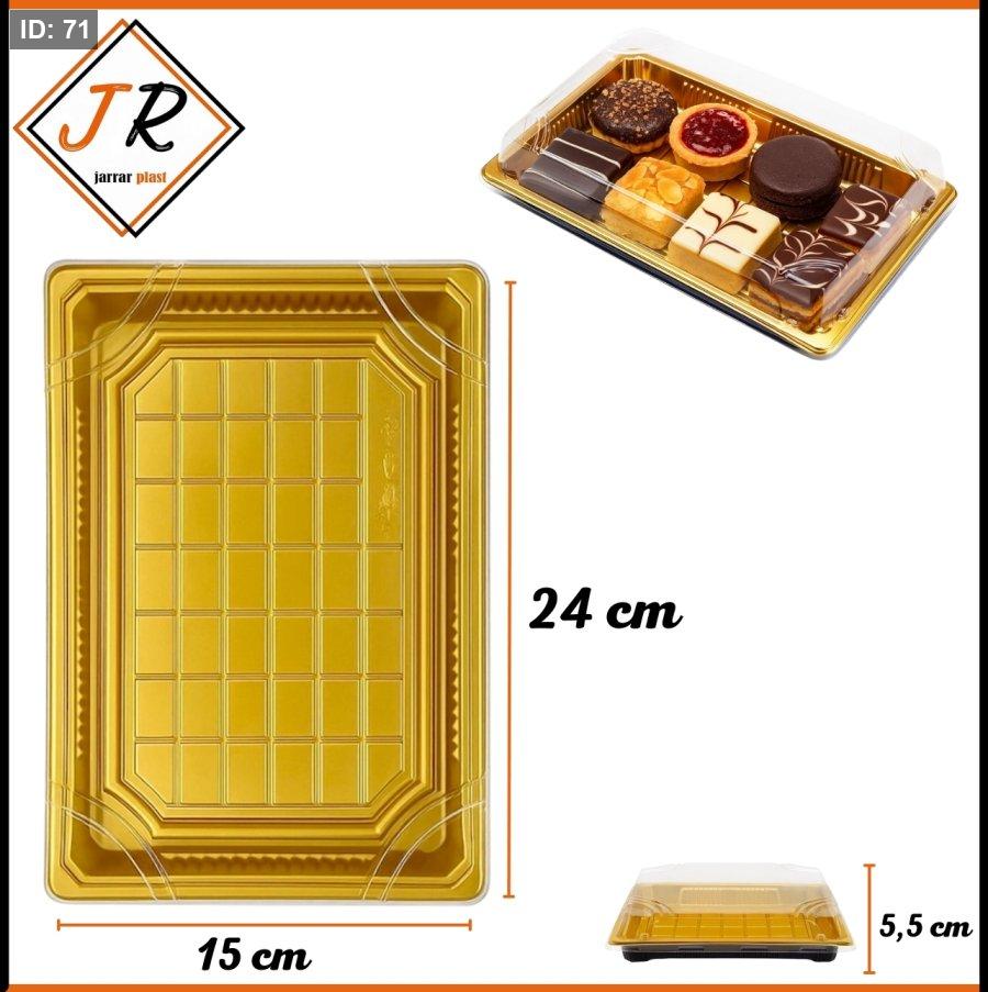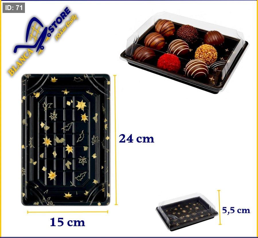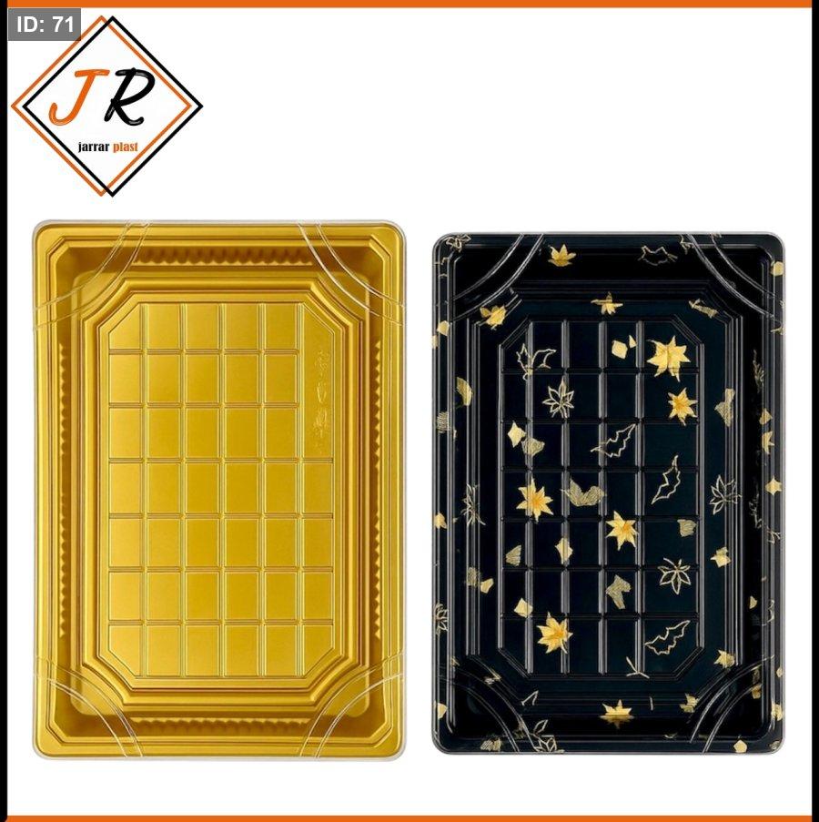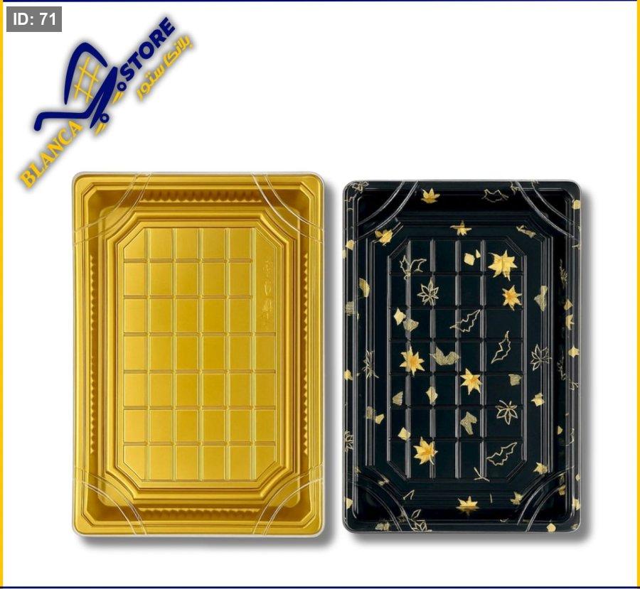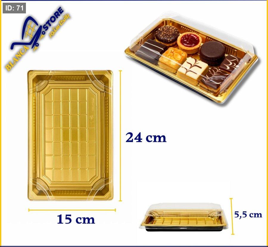 تأتي العلبة بألوان مختلفة للقاعدة، إحداها بلون ذهبي سادة والأخرى بلون أسود مع تصميم أوراق ذهبية، تتميز بأغطية شفافة لتقديم وعرض الحلويات بشكل جذاب