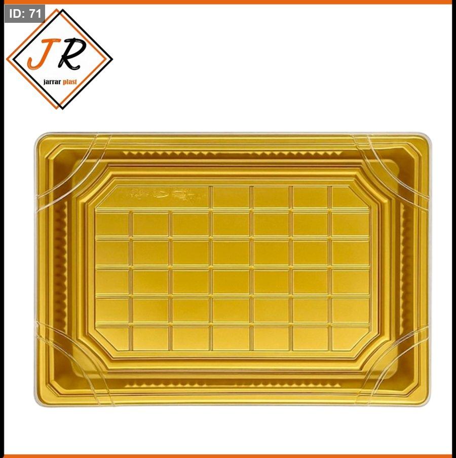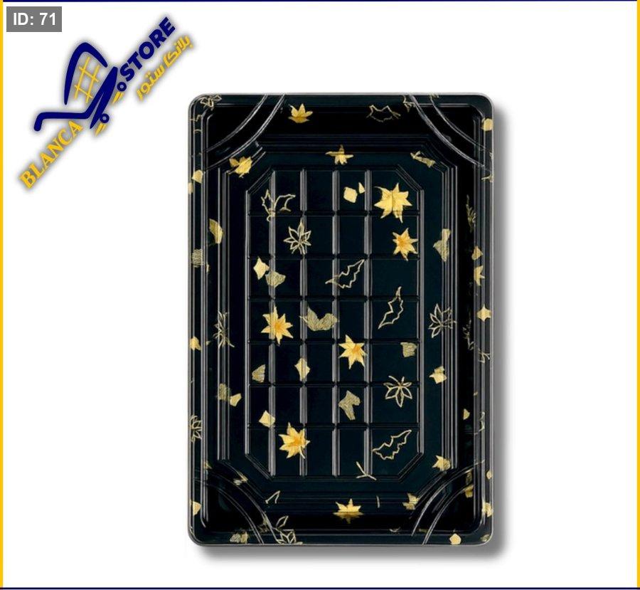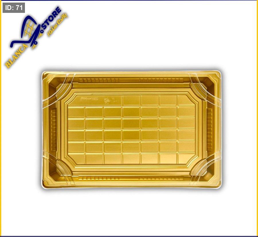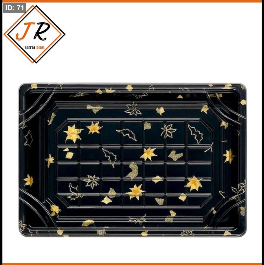 تأتي العلبة بألوان مختلفة للقاعدة، إحداها بلون ذهبي سادة والأخرى بلون أسود مع تصميم أوراق ذهبية، تتميز بأغطية شفافة لتقديم وعرض الحلويات بشكل جذاب