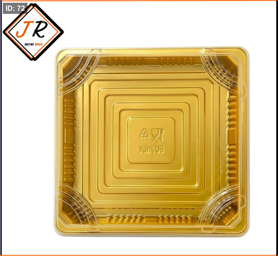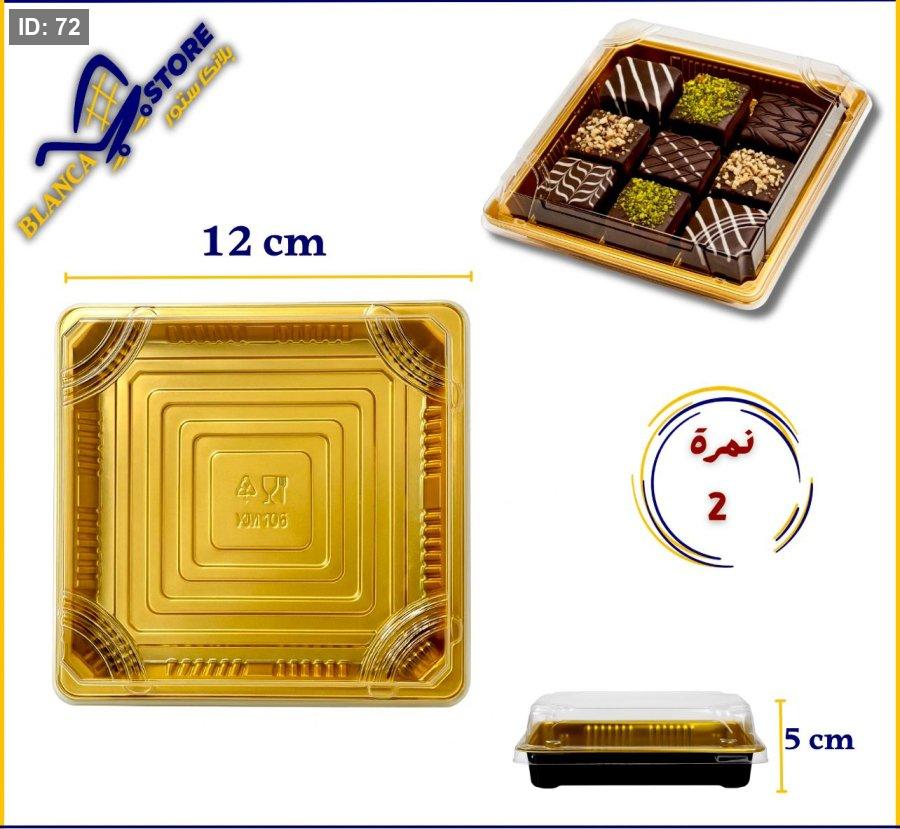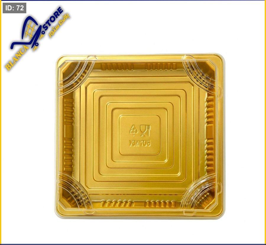 علبة بلاستيكية ذهبية بغطاء شفاف ذهبي مناسبة لتقديم وتخزين الشوكولاتة أو الحلويات، مصنوعة من البلاستيك الصحي والآمن تمامًا، تُستخدم في المطاعم والمحلات التجارية والمنازل لتقديم الحلويات بشكل جذاب وعملي