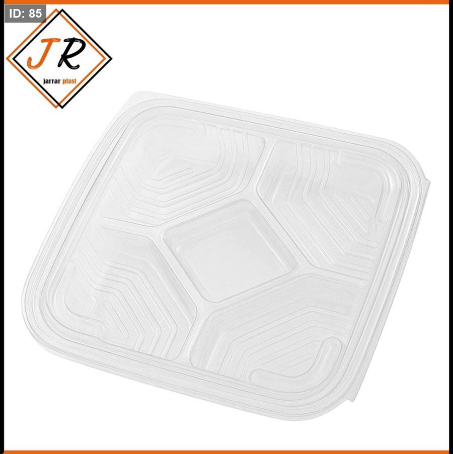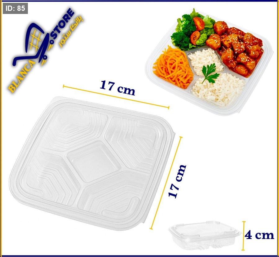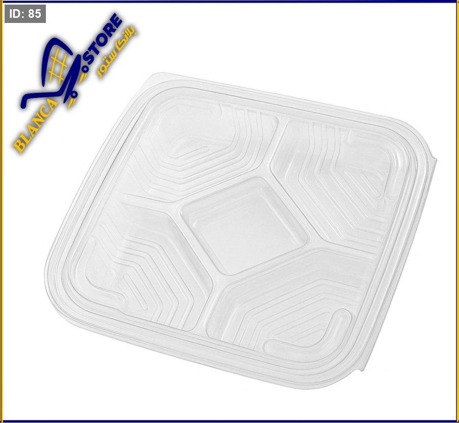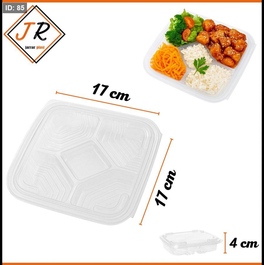 العلبة مصنوعة من بلاستيك متين مقسّم بخمس خانات، مثالية لتنظيم وتقديم الوجبات بشكل عملي ونظيف